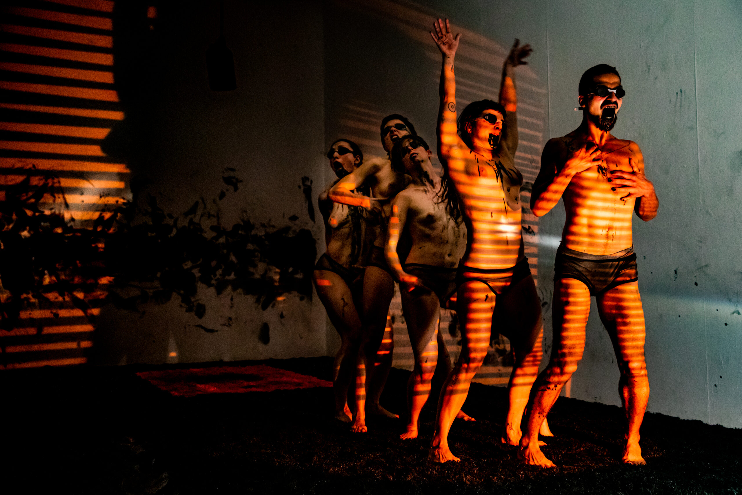 The audience will venture into an immersive experience where their own actions have consequences, and they are encouraged to take part , and act . Opening into a dark space , on a stage made of black canvas , the performers will slowly come to life exposing their bodies with maximum vulnerability , nudity and blindness. The abstract journey will be focussed around exploring the possibilities of physical expression with limited use of our senses , removing one of our primary ones: Eye sight.